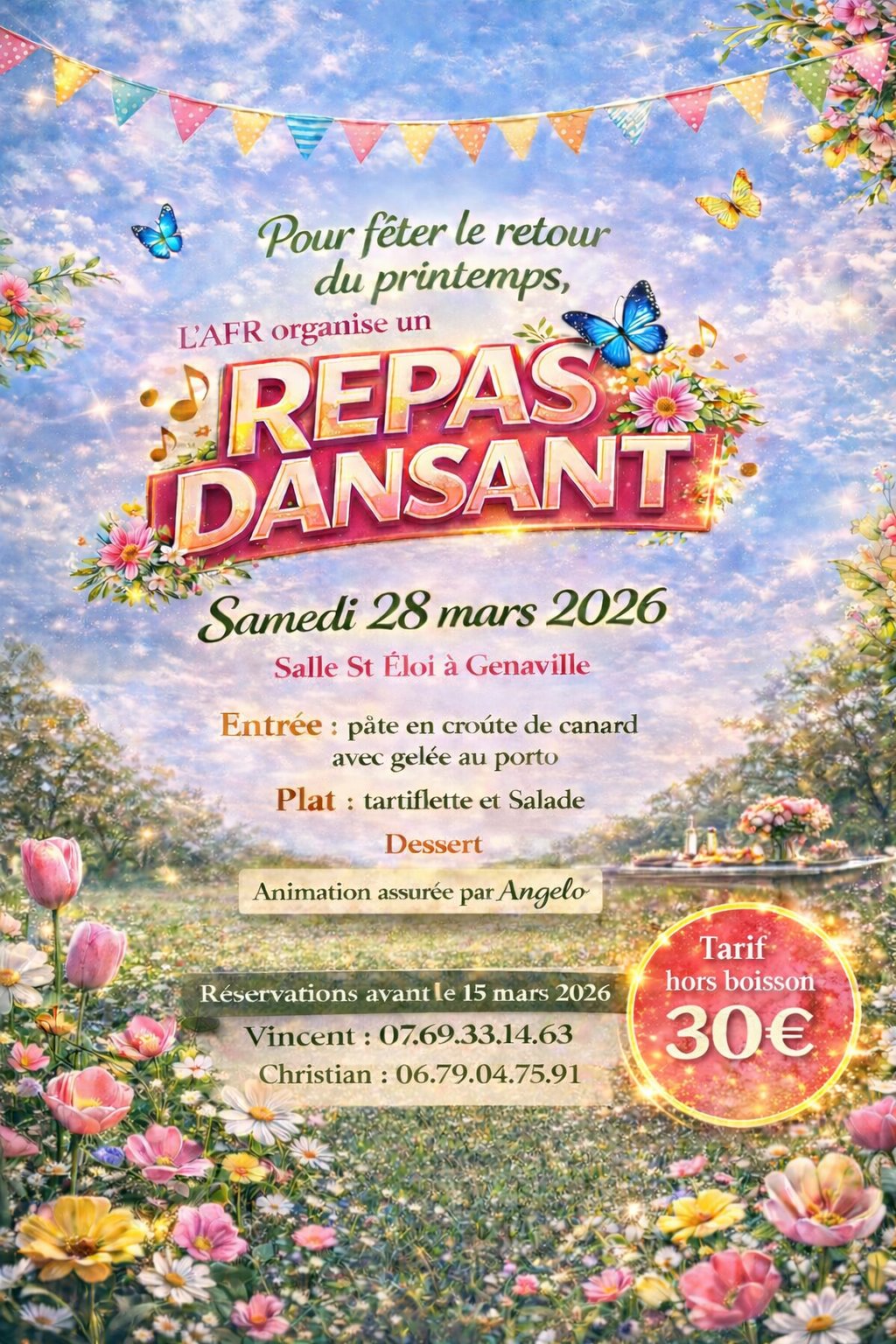 L'AFR organise le Repas dansant le samedi 28 mars 2026 à 20h00 à la salle Saint Éloi de Génaville.